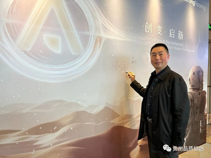 上午9:00,阿姆斯壮地材经销商们陆续到达会场,并在签到墙上签下了各自的名字,以及对2022年的祝福语,在新的起点上,开启新的征程。